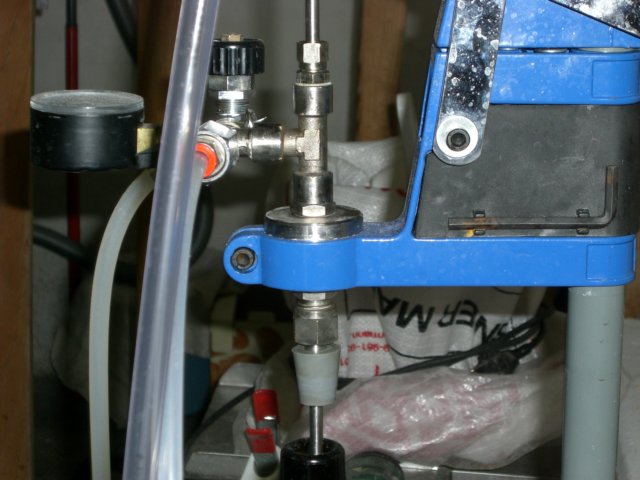 Flaschenfüller Marke Eigenbau (umgebauter Handfüller von Braupartner Kling befestigt in Bohrmaschinenständer) für 0,5 L Flaschen bis 2 L Siphons.