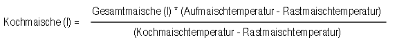 Wer ein Dekoktionsverfahren ausprobieren will, muss allerdings die Teilmaischemengen berechnen. Dies geht über das sogenannte Mischungskreuz oder über die nachfolgende Formel (in der das Mischungskreuz versteckt ist).