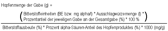 Hat man sich über alle die Hopfengabe bestimmenden Einflußgrößen Klarheit verschafft, kann man mit nachfolgender Formel die notwendige Hopfenproduktmenge berechnen: